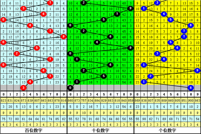 百位分析:第2025276期-第2025280期开出号码:70674,波动了7个点位,分别较松散,本期预计该位下降,关注号码3。